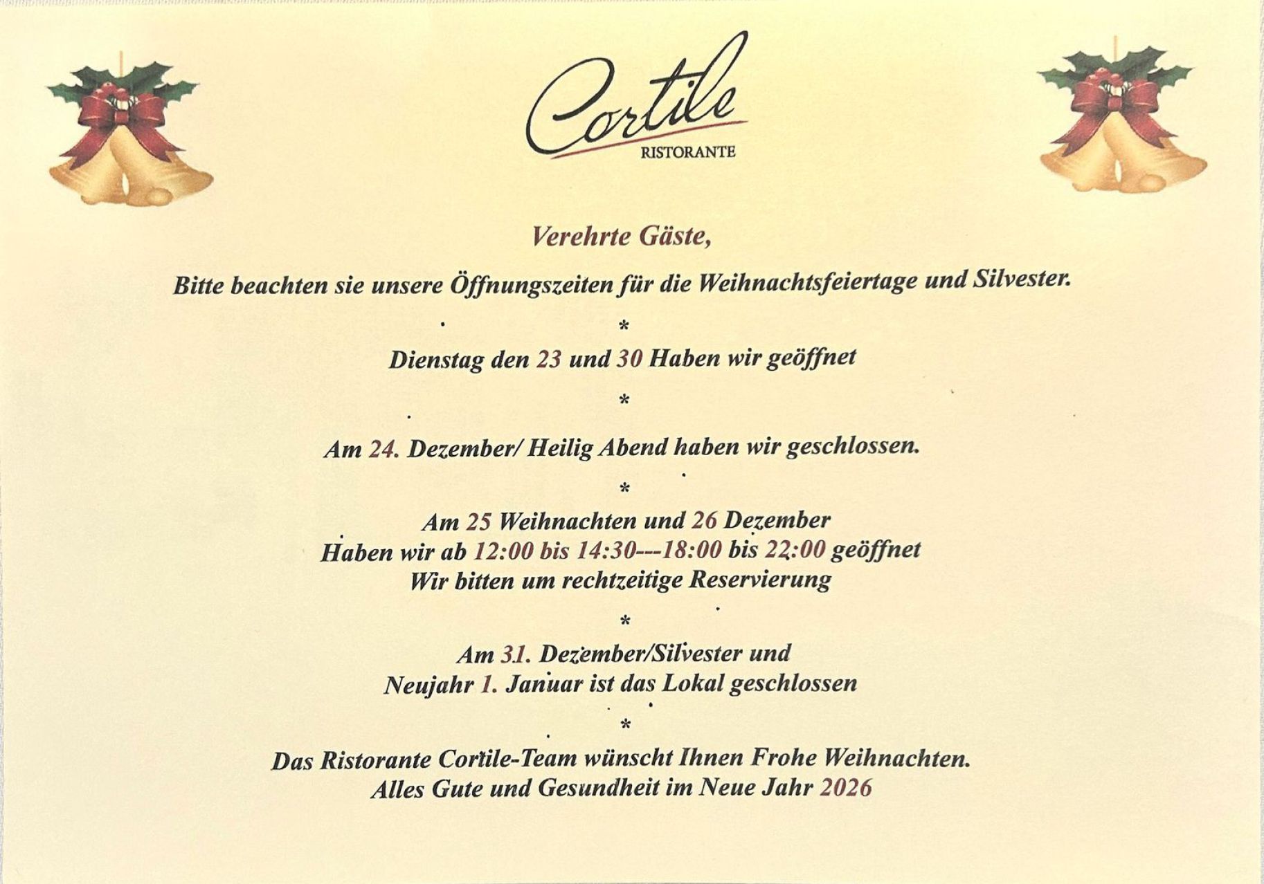 Das Ristorante Cortile ist seit dem 1. Januar 2017 unter neuer Leitung geöffnet. Seien Sie unser Gast und
